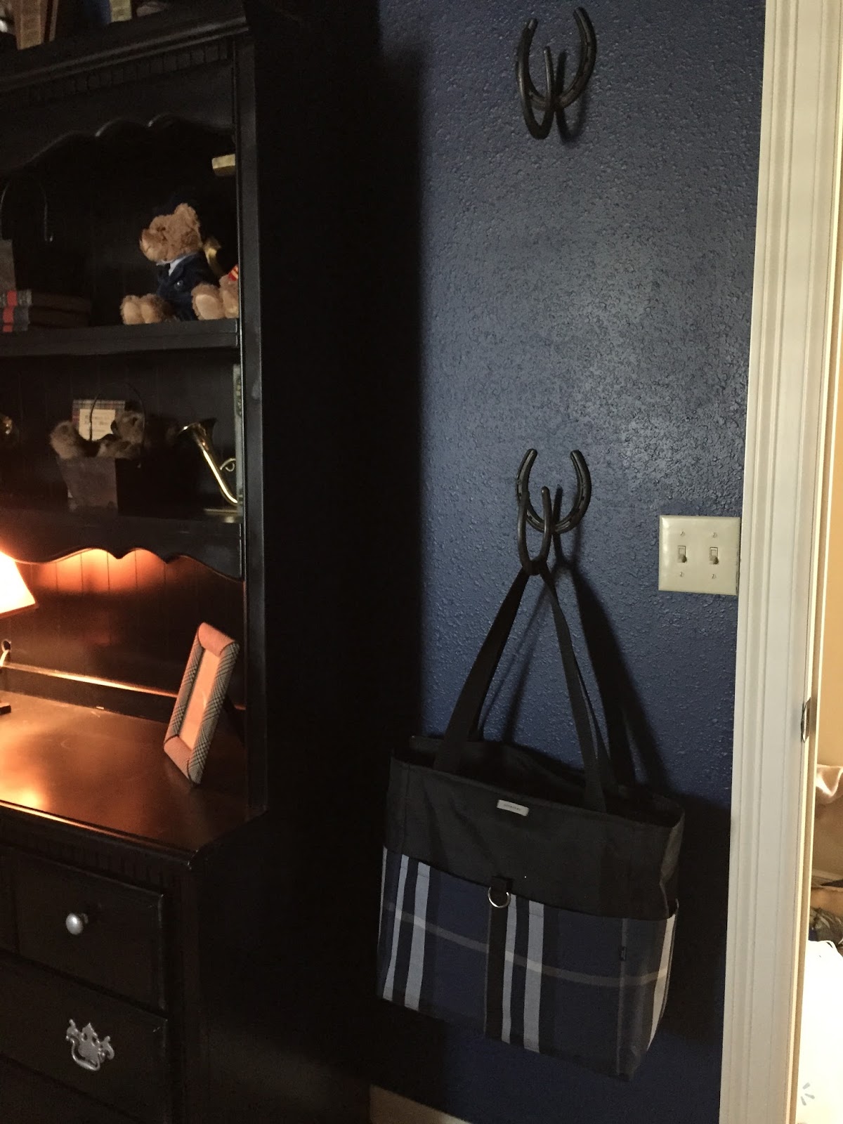 Here is our most recent adventure. The nursery. This is for our first grandson on the way. His mommy was inspired (obviously) by Ralph Lauren Polo with all the dark colors, the warmth of clutter, the classic shimmer of touches of gold and of course, plaid. But not just any plaid. We searched high and low for just the right composition of blue, green, subtle yellow and subtle red. One of our most fabulous finds was the oil painting over the changing table. We found it in a little antique shop in Jenks, OK. We all agreed it would be the focal point of the nursery and we were not disappointed.